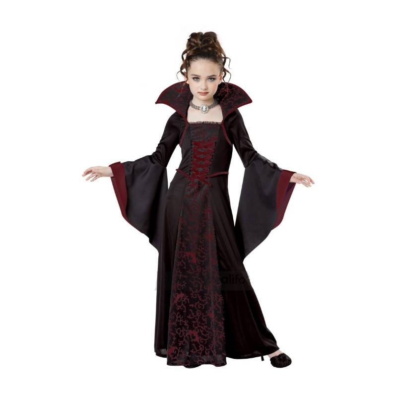 Make a grand entrance in the Royal Vampire child costume. It is a long dress featuring a stand up collar and dramatic flared sleeves. It has a lace up decoration on the bodice. It also comes with a necklace with attached cameo. Shoes are not included. Buy this for Halloween, themed parties throughout the year, cosplay, school plays, and more. It is available in 3 child sizes. This can also be used for renaissance themed affairs.