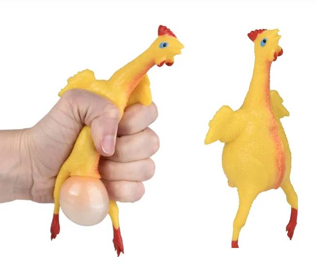 Rubber Squeeze Chicken Popping Egg. Squeeze this 7″ Chicken and you’ll see it “lay an egg.” This yellow rubber chicken features an egg filled with white swirly liquid and a yellow ball for the yolk!