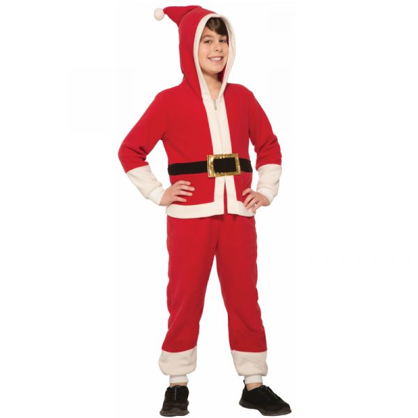 Santa Onesie Unisex Child-Youth Christmas Costume features a hooded red jumpsuit with white trim and an attached gold fabric belt buckle. This is an easy costume idea for school or trick-or-treating. This onsie pairs well with Child Elf Outfit.