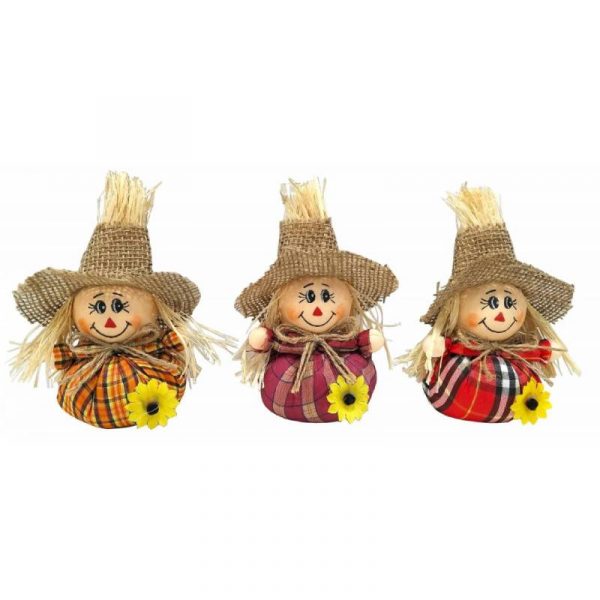 Buy a cute little smiling round-bodies scarecrow to decorate this fall! Each one measures about 6″ tall and about 3″ in diameter. Assorted prints.