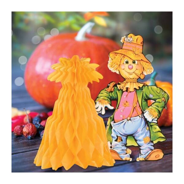 Scarecrow w Tissue Corn Shock Centerpiece will bring your Fall or Thanksgiving decorations together. Place this on each table to complete the holiday look.