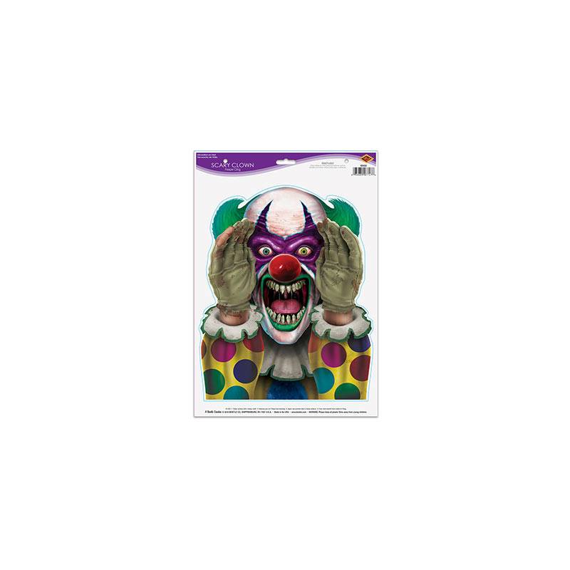 Scary Clown Peeper Cling is perfect for giving your guests a jolt of fear. One 12″ x 17″ sheet per pack. This product does not use tape or adhesives. It will cling to most smooth, nonporous surfaces.