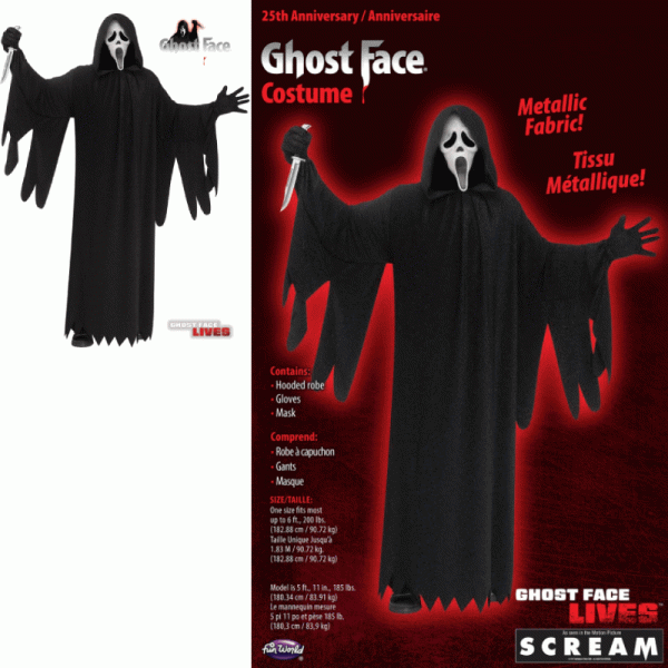 Scream Ghost Face® 25th Anniversary Costume. This is the official 25th Anniversary Ghost Face Costume by Fun World – Easter Unlimited Manufacturing. As seen in the motion picture SCREAM. This one features a sparkly robe. One Size: Adult Standard. Costume includes