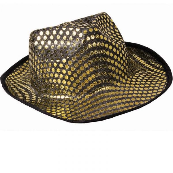 Wear this inexpensive, gold sequined fedora hat for a pimp Halloween Costume or as a glitzy Roaring 20s accessory. Fits most adults!