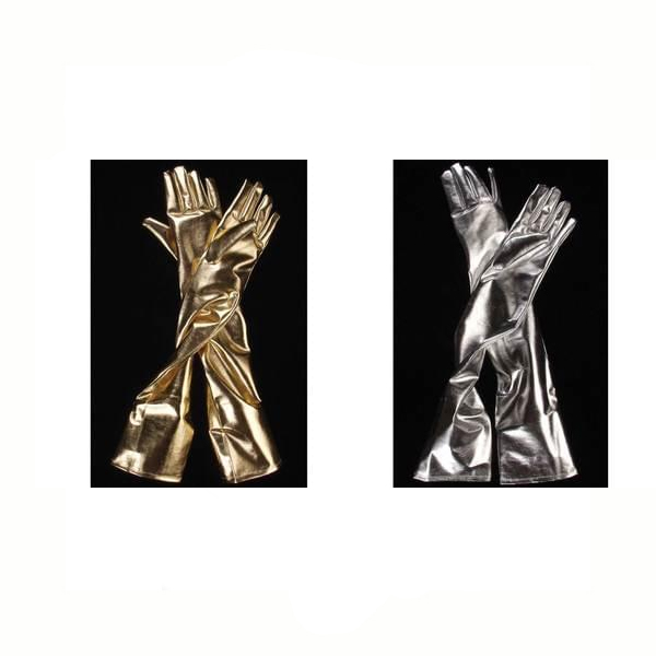 Choose a silver or gold Shiny Metallic Fabric Extra Long Gloves to accessorize your Halloween Costume. These fashion gloves measure 23″ long!