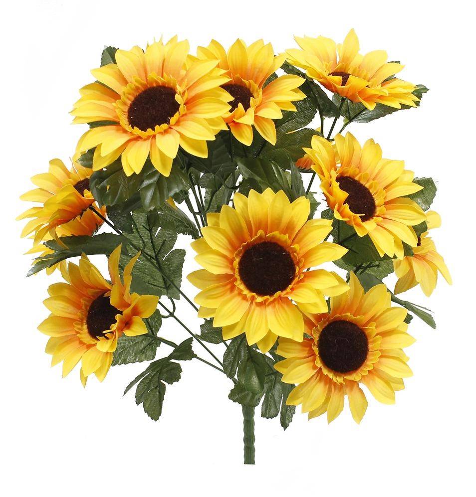 This Silk Sunflower Bush features 14 flower heads and deep green foliage and stems. Perfect for fall arrangements!