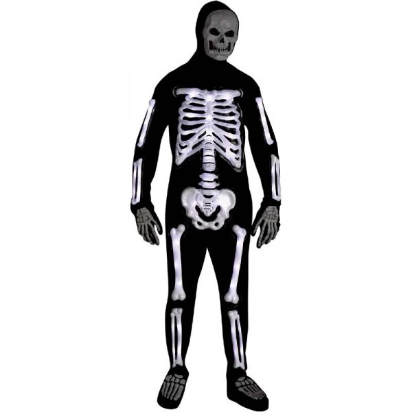 This Skele-Bones Light-Up Costume features an LED LU Jumpsuit, Hooded Mask, Gloves, and Shoe Covers. Includes a Battery Pack. Requires 2 AA batteries (not included).