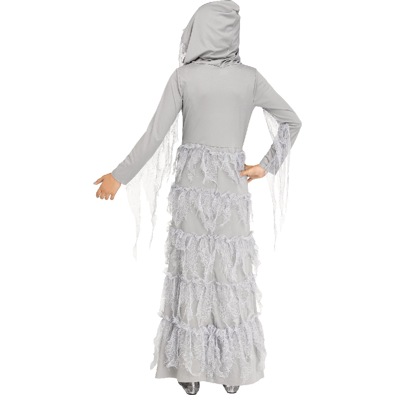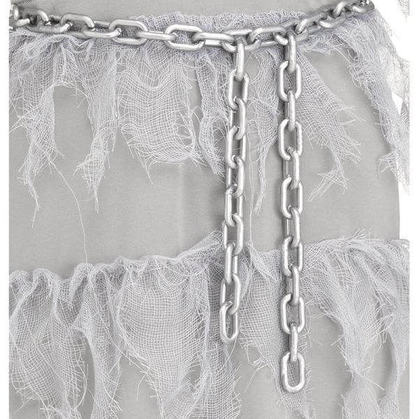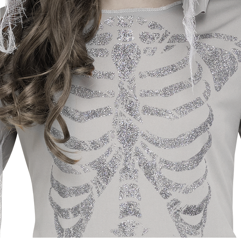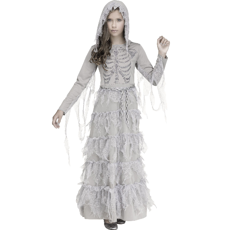 Haunt the night in Skele-Ghost Girl Child Costume. This is a full-length knit poly gown with long sleeves. It has an attached hood with jagged, sawtooth edges. A gauze-like material rests on the hood. The bodice features a silver glitter rib cage. The chain accent hooks on each side with white elastic loops. The chain is lightweight and does not go around the waist- it is only in front. Wear this for Halloween, theatrical productions, reenactments, cosplay, school plays, themed parties, birthday parties and more.