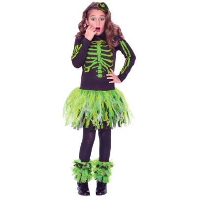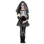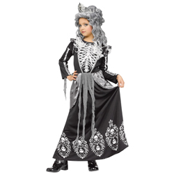 Skeleton Queen. Black and gray with white printed skeleton bones, this dress is perfect for a little queen on Halloween.