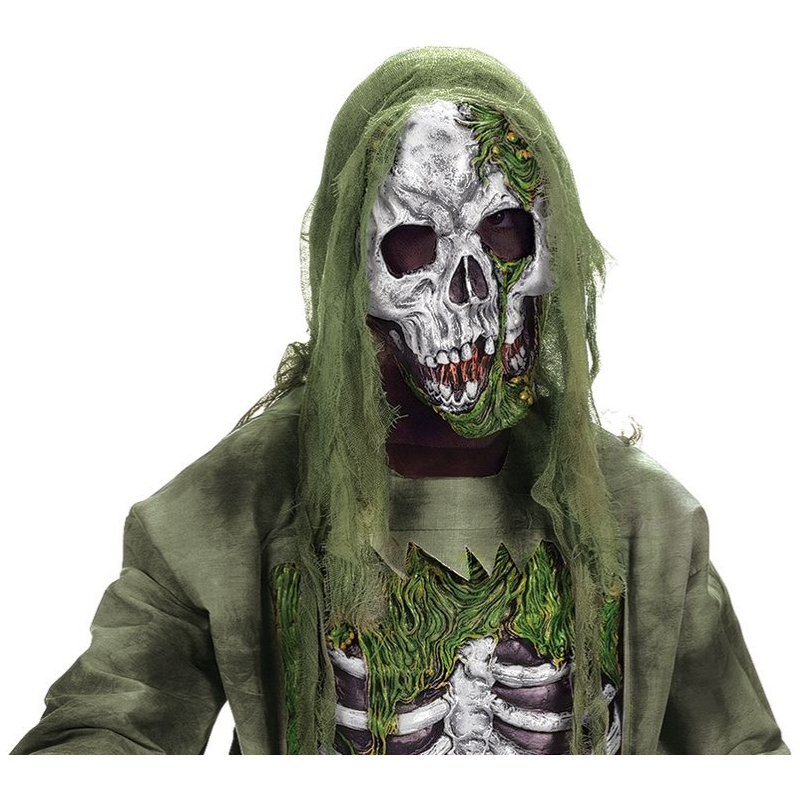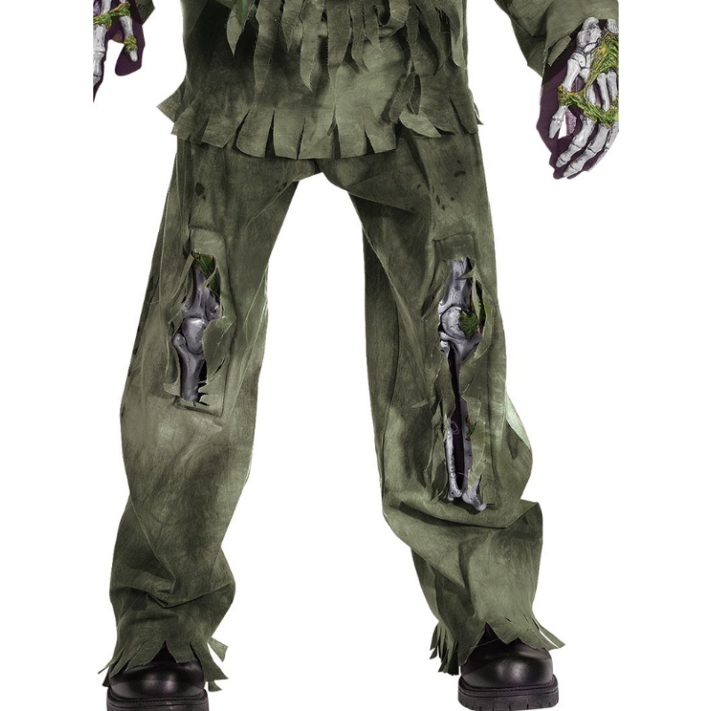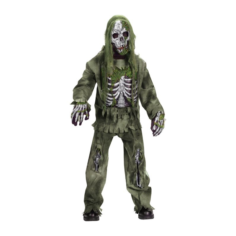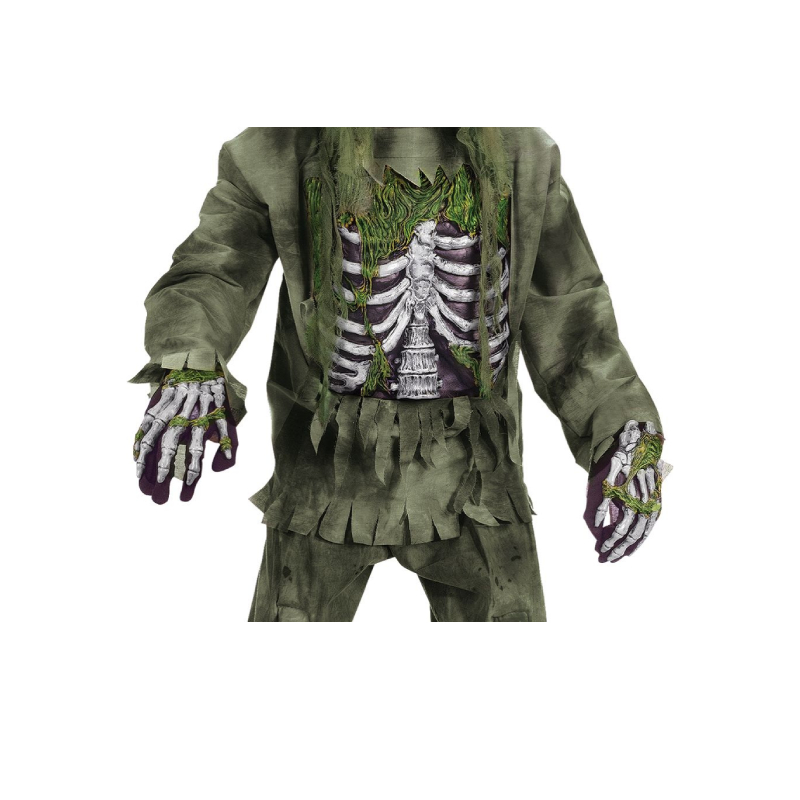 Haunt your victims with Skeleton Zombie Child Costume. This costume comes equipped with a gruesome mask, skeleton hands, a top with an attached exposed rib cage, and tattered pants, exposing screen printed leg bones. It comes in a child size large.