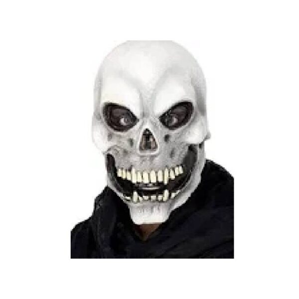This Skull Overhead Latex Mask is a full-head mask designed to resemble a human skull. Made from latex, it is flexible and durable, capable of conforming to various head sizes. The design features intricate detailing, including eye sockets, nose cavity, and teeth, to create a realistic and eerie appearance. The mask also includes openings for the eyes, nose, and mouth to ensure comfort and ease of wear.