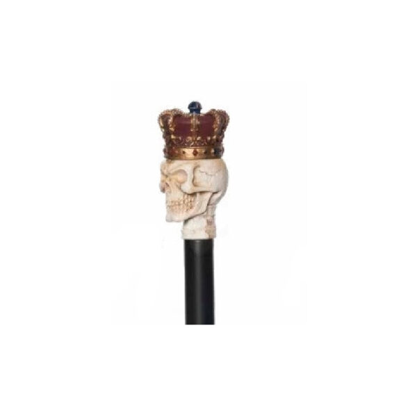 Atop the skull handle sits a small crown, adding a touch of royalty and grandeur to the cane. The crown is ornate, featuring details such as faux gems, intricate patterns, and stunning colors.