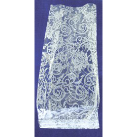 These clear cello bags have white lace printed on them. They are 3.5″ x 2″ x 7.5″ bags with gussets. Available in each, dozen, or 100 packs