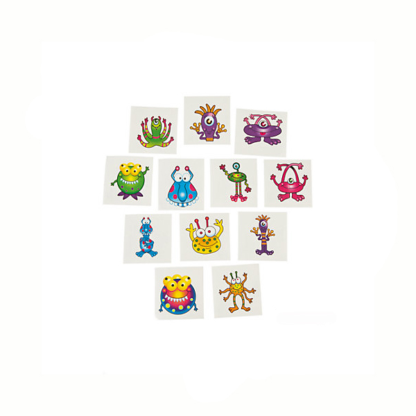 Assorted Styles of Monster temporary tattoos. Cute and colorful, the kids love them. Great for Halloween or year round.