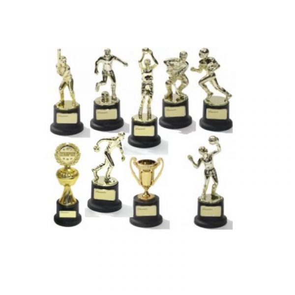 Each Trophy measures between 4″ and 6″ tall, including the base. It is plated plastic gold on black base with small gold plaque with words “Presented To” printed on it.