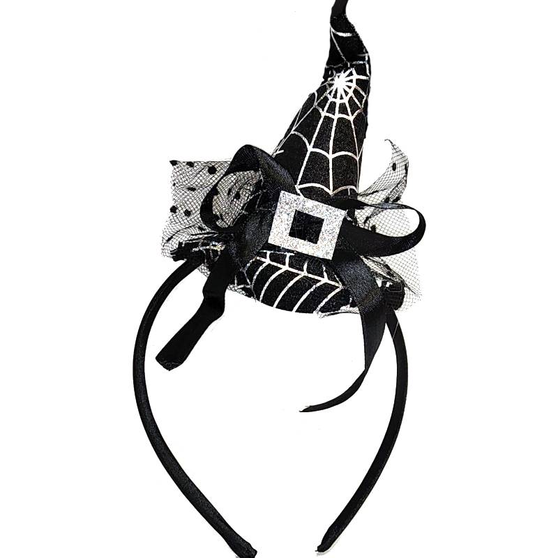 Small Spider Web Witch Hat Headband w Buckle is black with silver metallic webbing. Netting with polka dots is held in place by a satin bow and a glittery buckle. It stands about 4″ tall and it fastened to a black satin-covered headband.