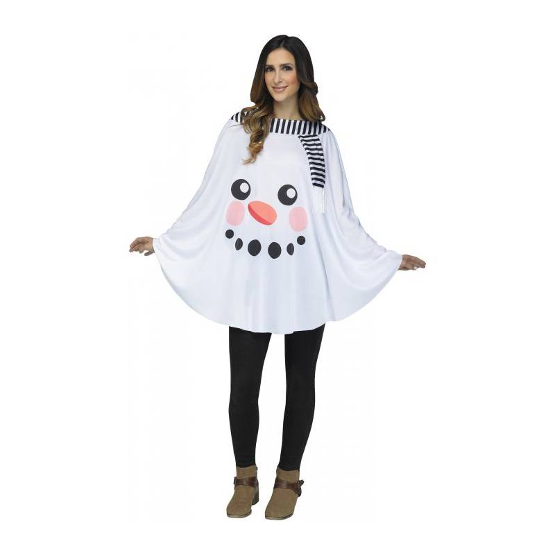Bring smiles to the crowd with Snowman Poncho. This is an Adult Standard which fits womens size 4-14. This is a cute, lightweight poncho. The smiling snowman brings cheer to everyone who sees it. Slip this poncho over your head for a quick and easy costume. Wear this for Halloween parties, trick-or-treating, office get-togethers, school celebrations and more. Bring holiday cheer to Halloween and in the winter months.