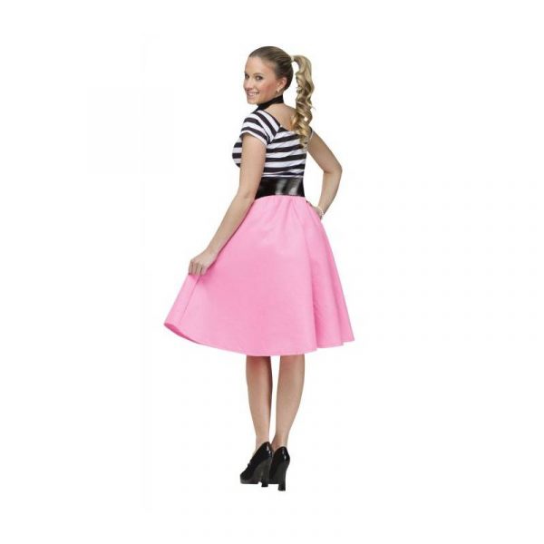 Jump back in time to the age of sock hops and soda shops and wear Soda Shop Sweetie Adult Costume. This costume features a dress that has a black and white striped top and a scoop neck and a pink poodle skirt bottom. It comes with a black detachable belt. The neckerchief is soft and breathable, making it comfy to wear all night. The skirt is 50’s fashionable knee length and has a sequins leash running from the waist to a posh poodle at the bottom of the skirt.