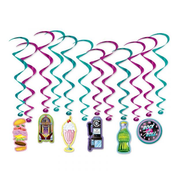 These whirls feature a hamburger with all the toppings, and old school juke box, soda pop, and rotary pay phone. Enjoy these along with our Soda Shop Sign Cutouts and Insta-Theme Soda Shop Tables and Stools Props.