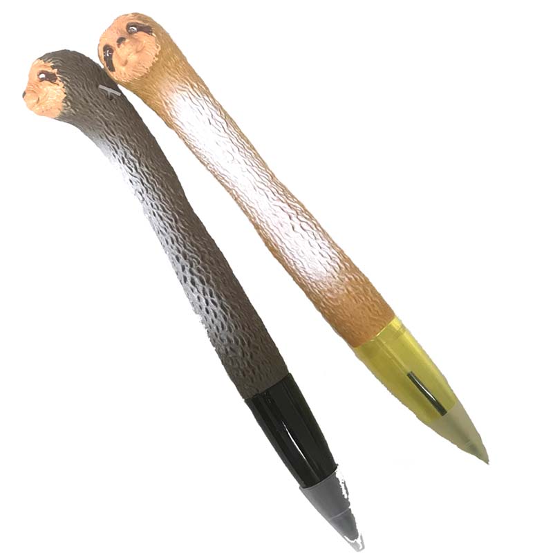 This Party Soft Rubber Sloth Pen features black ink and a white chest. Choose from tan or brown sloth figure. Measures 8″ tall!