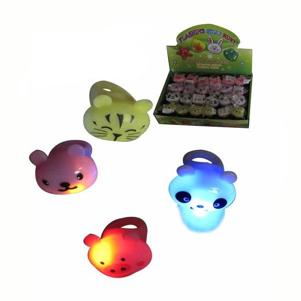 Soft Rubber Zoo Animal Rings light up and flash when you press on them. Press the ring again to turn the flashing light off. Your choices include a white panda ring, yellow lion ring, pink piggy ring, and a lavender teddy bear ring.