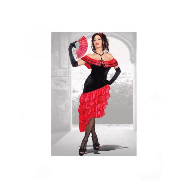 Spanish Dancer Adult Halloween Costume Dress includes a flirty black velvet asymmetrical dress with off the shoulder neckline and ruffles. Wear this dress by yourself or as part of a couple’s Halloween Costume. The other partner could wear the Spanish Mariachi Hat.