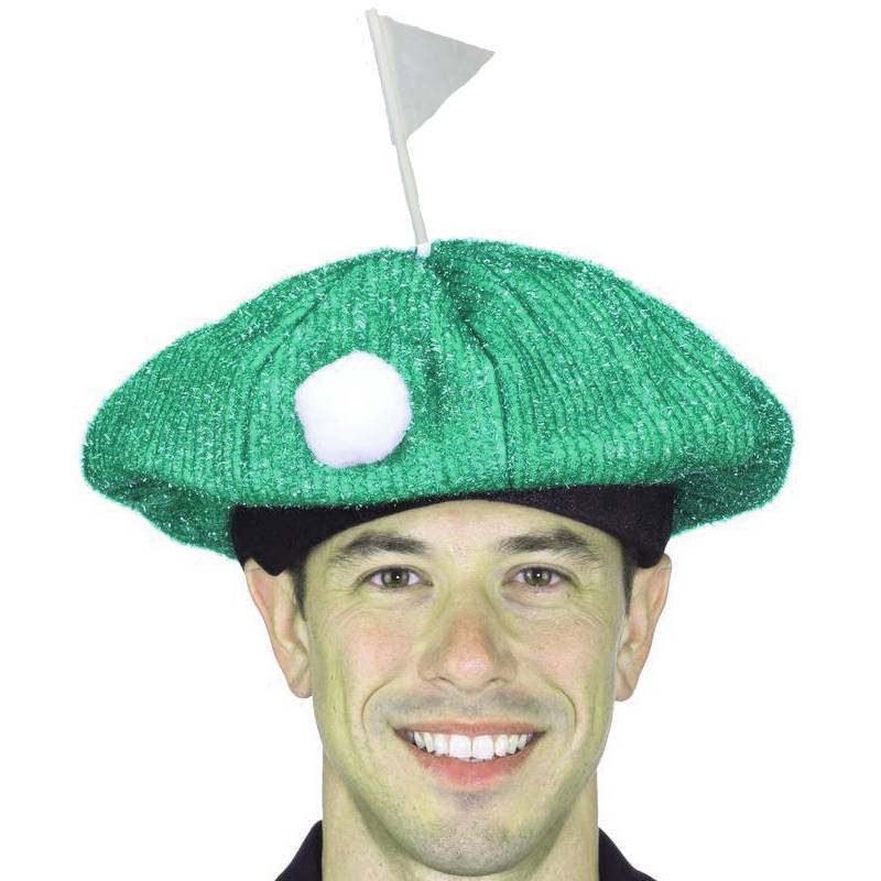 Wear a Sparkle Fabric Golf Course Hat for a Charity Golf Outing or to surprise your foursome! This fun hat features a sparkling green trimmed fairway, white flag and a white plush golf ball.
