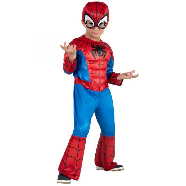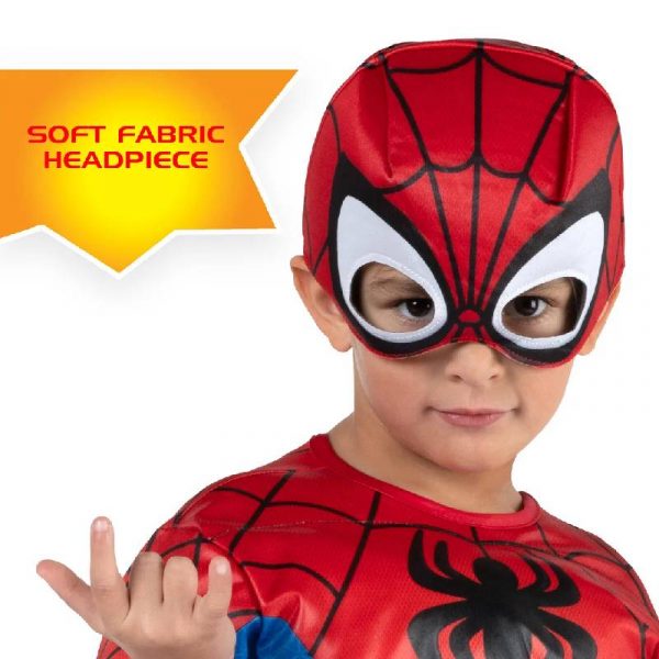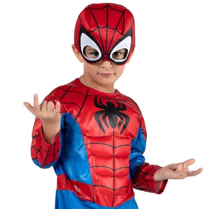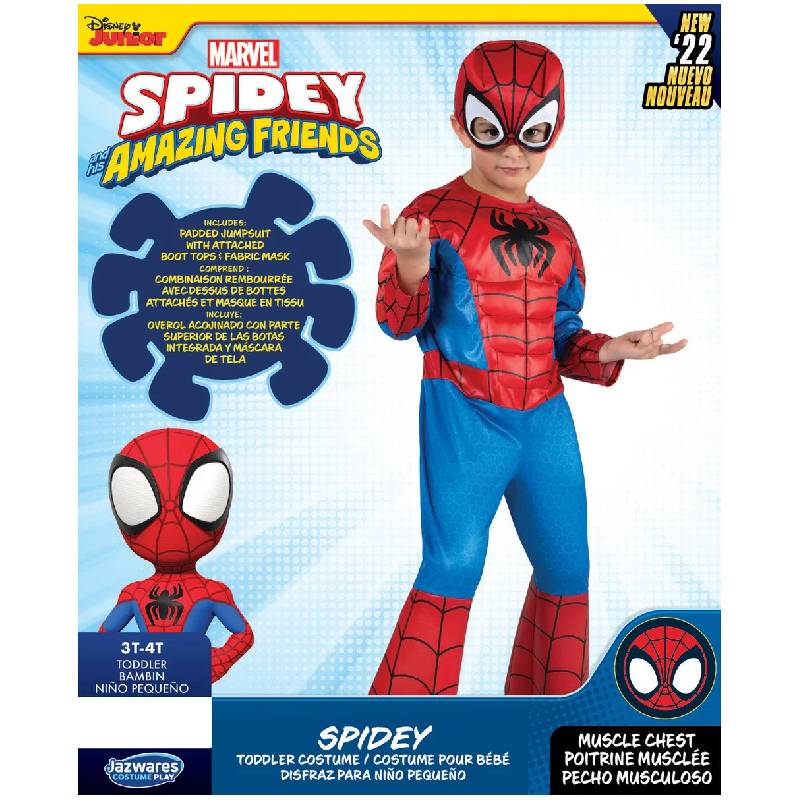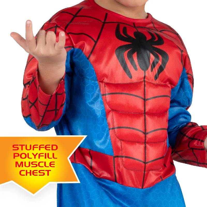 Spidey Muscle Chest Toddler Spiderman Costume. Inspired by Peter Parker’s spider suit in Spidey And His Amazing Friends. It’s cut from a comfortable poly jersey and stuffed with polyfill around the arms and chest to show off Spidey’s strong physique. This costume also includes a fabric Spidey mask to help conceal your kid’s secret identity. Collect this Spidey Toddler Costume and wear this for Halloween, themed parties throughout the year, theatrical performances, licensed costumes parties, and more. Officially licensed by Marvel.