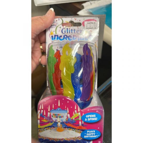 Sing “HAPPY BIRTHDAY” along side Spinning Glitter Incredible Birthday Candle. This glittering, spinning candle also sings “HAPPY BIRTHDAY”! This candle can be washed and reused. This is really easy to use! Light the center and watch it spin, open, and sing. Lighting the center will light the others as the spin out. This is much easier than lighting several candle individually. You don’t have to worry about burning fingers and arm hairs. This is a fun and easy way to celebrate a birthday.