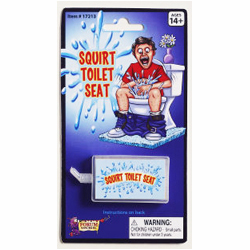 Fill this plastic device with water and stick it to the under side of the toilet seat. When someone sits down on the seat, it will squirt out.