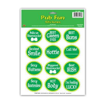 St Patrick Pub Fun Stickers can add flavor to a bland outfit or plain invitations. “Best green eyes”, “sexiest smile”, “I’m feeling lucky” are only a few examples of how much fun these sayings are!
