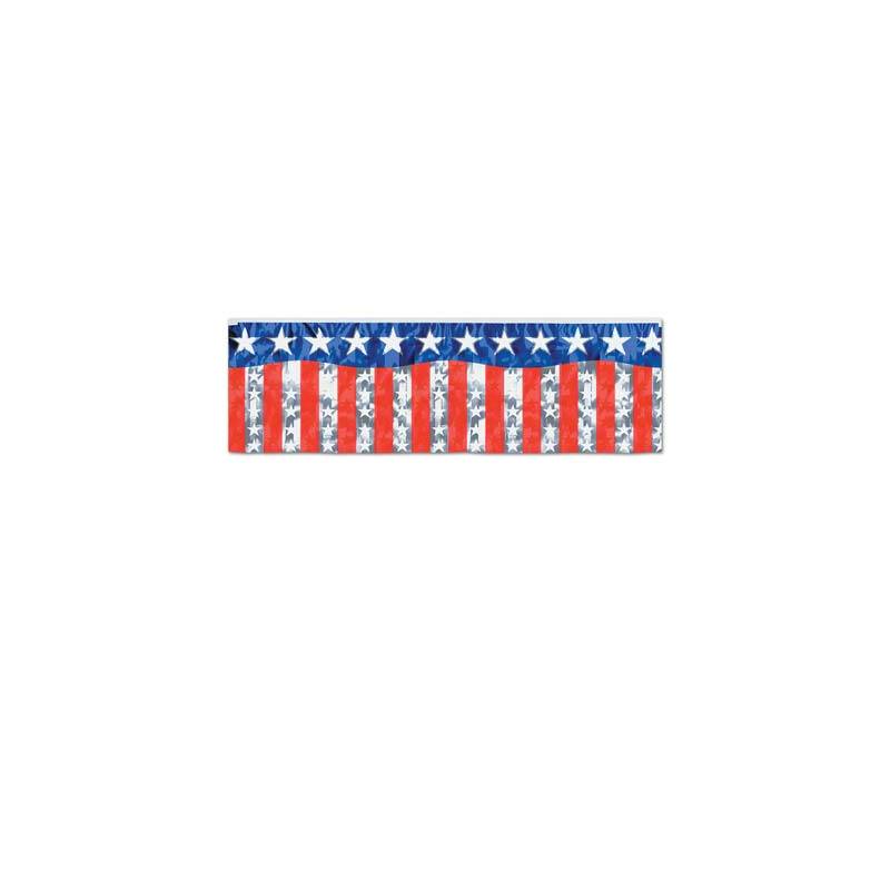 Stars and Stripes Metallic Fringe Banner is flameproof and measures 14″x4′. Decorate for your 4th of July party or any patriotic celebration!