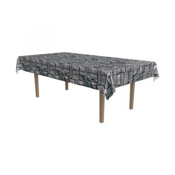 Stone Wall Table Cover creates a medieval vibe. Use this for Halloween or Dungeons and Dragons parties. Step into the dungeon of Halloween fun. Use this for easy clean up. Messes wipe away easily and you can throw it away without feeling guilty.