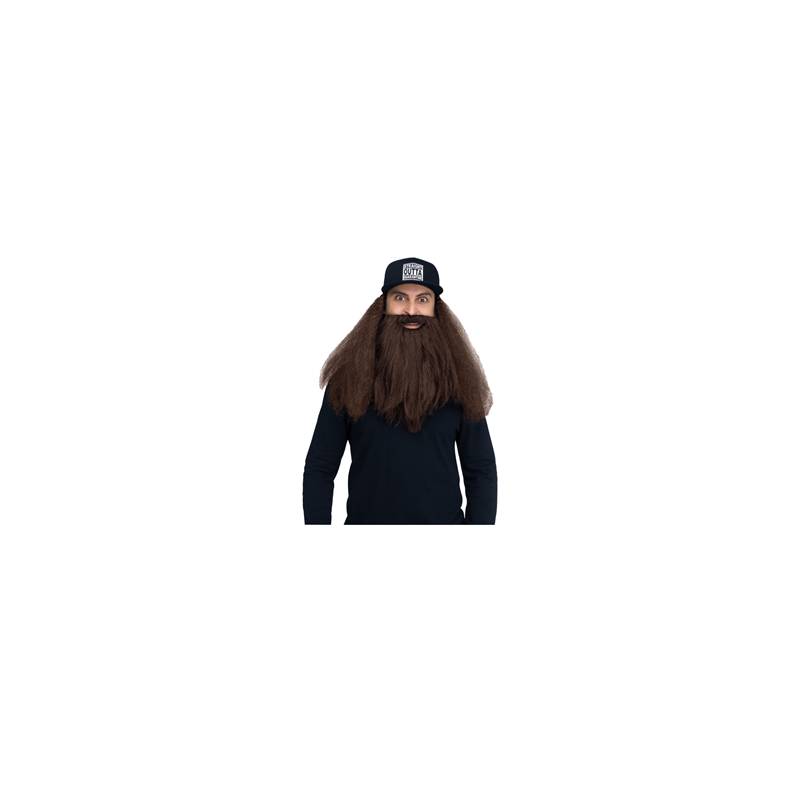 Straight Out Of Quarantine Costume Accessory Set includes hat with attached long, brown, uncut hair, and a long matching beard with an attached mustache. The beard and mustache have attached, elastic ear loops to hold them in place.