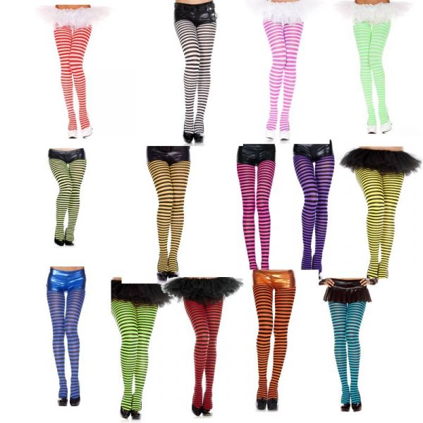 Striped tights. Many color combinations. Wear these striped tights for not only your Halloween costume needs, but also for sports fans, school spirit wear, and just for fun! Colors are bright! Six color combinations available in queen size: Black/Neon Green, Black/Red, Black/Yellow, Black/Hot Pink, Black/Purple, and White/Red.