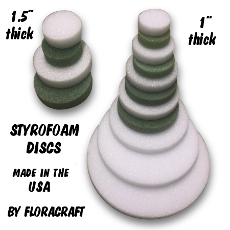 Our styrofoam discs are made in the USA by FloraCraft and range in size from 3″ to 12″ diameter (1″ thickness) and 4″ to 6″ diameter (1.5″ thickness). Use them for adding height or structure to floral arrangements. Create props for displays or costuming. They also make a great base for practice learning how to decorate cakes!