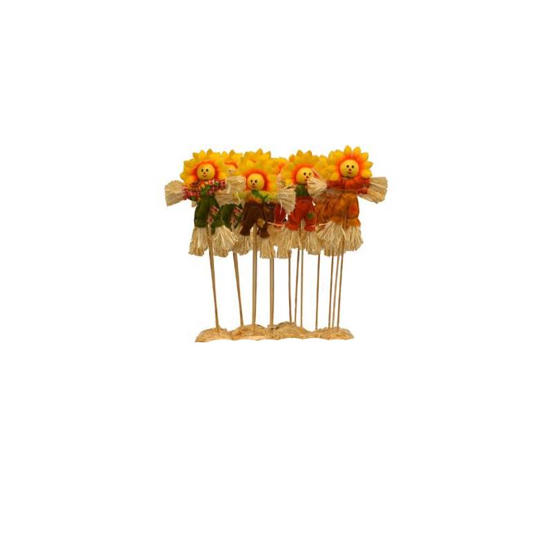 Sunflower Head Scarecrow Fall Halloween Decoration features a 10″ wooden stick. Use it in fall flower arrangements, and centerpieces!