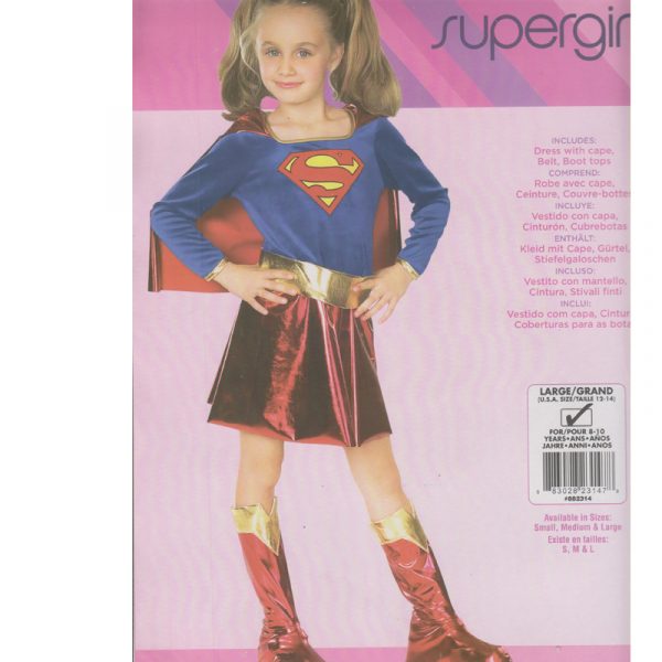 Supergirl Child Halloween Costume includes a belt and boot tops. It features a velvety soft, navy blue dress with shiny red skirt, a “Superman” appliqué, and gold lamé trim. The matching red cape is detachable. The red/gold boot tops feature an attached black elastic strap with a velcro-like closure to go around the bottom of the child’s shoes. Package also includes a gold lamé belt that ties in the back.