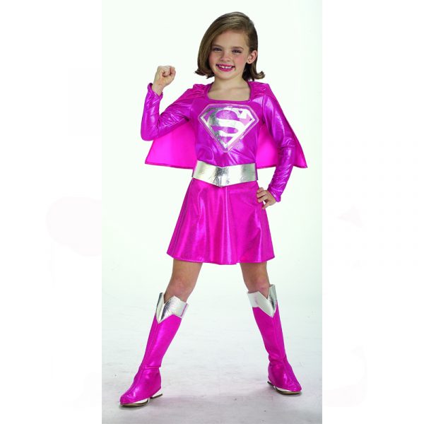 Super girl Pink girl’s Superhero Costume will transform your girl into the super hero that she has always wanted to be. She can be the hero of Earth with her cousin Superman or let your girl be the super hero of her own domain. This is a pink dress with a pink cape, a silver belt and a silver Superman “S” on the front.