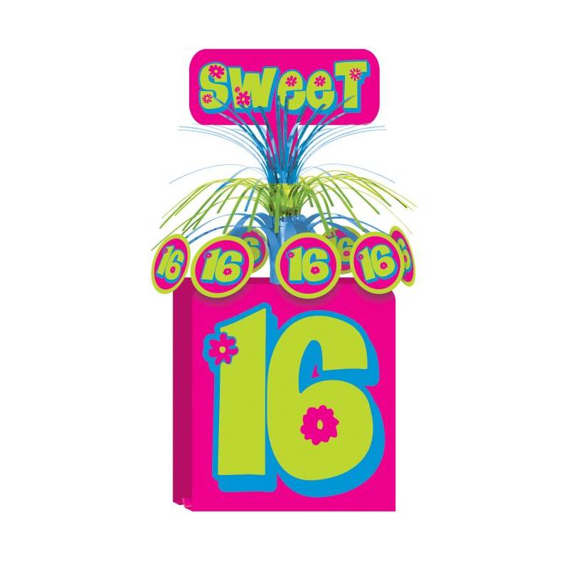The base of Sweet 16 Centerpiece w/ Foil Burst is made of Hot Pink and Hot Lime Green cardboard and has a “16” printed on it.