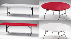 Stay put table cover. These plastic table covers stay in place even on a windy day! They are available in white, black, or red, in round or rectangle table covers.