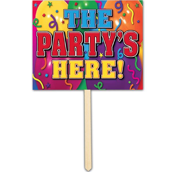 This sign is brightly colored with balloons and confetti in the background. Use this to mark your house; it is sure to get the attention of your party guests.