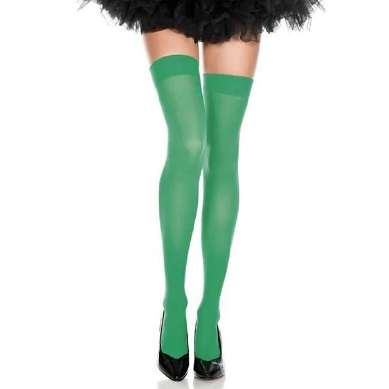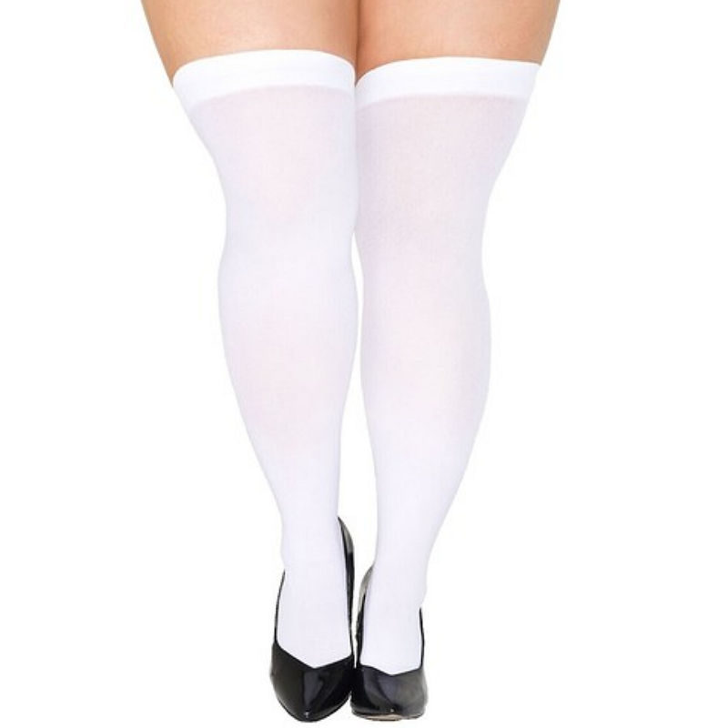 Opaque thigh highs are available in eight assorted colors. White is available in both standard and plus/queen sizes.