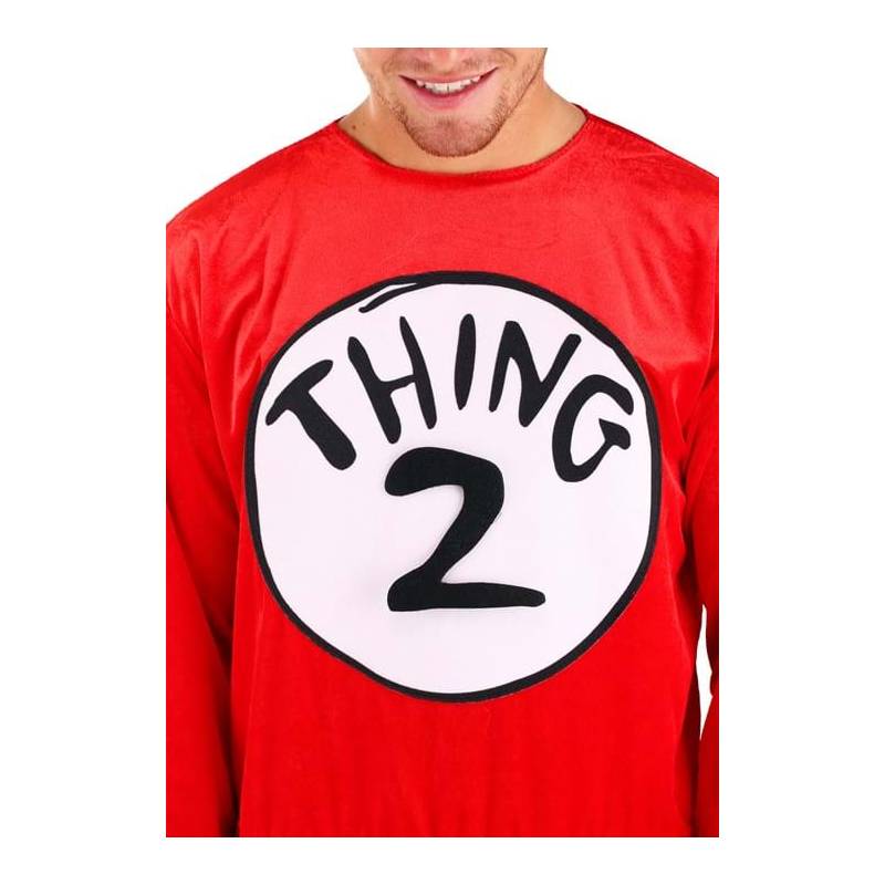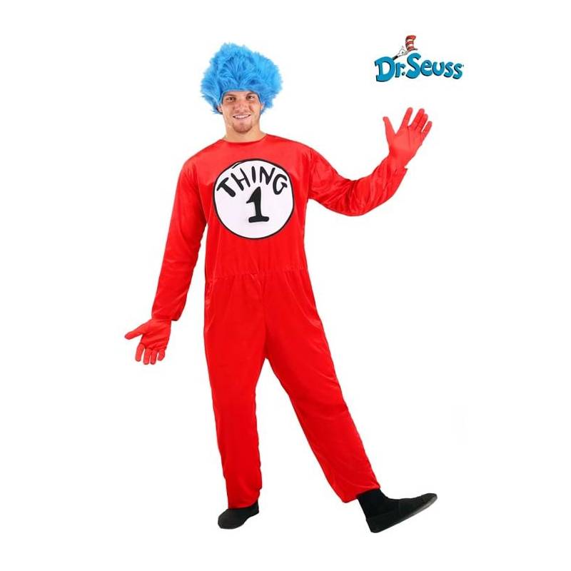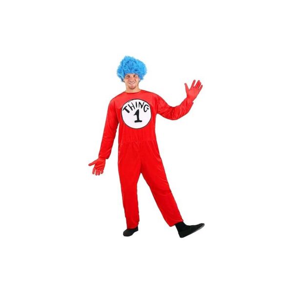This Thing 1 and Thing 2 costume is a playful and iconic representation of the mischievous characters from Dr. Seuss’s beloved book “The Cat in the Hat.” The costume consists of a red jumpsuit, blue wig, Thing 1 and Thing 2 icons. The icons are removable so you can choose which one! The jumpsuits features long sleeves, a high neckline, and a comfortable, loose-fitting silhouette for ease of movement and wearability. Each jumpsuit is emblazoned with a removeable large white circle on the chest, featuring the iconic “Thing 1” or “Thing 2” designation in bold, black lettering, just like in the original book illustrations.