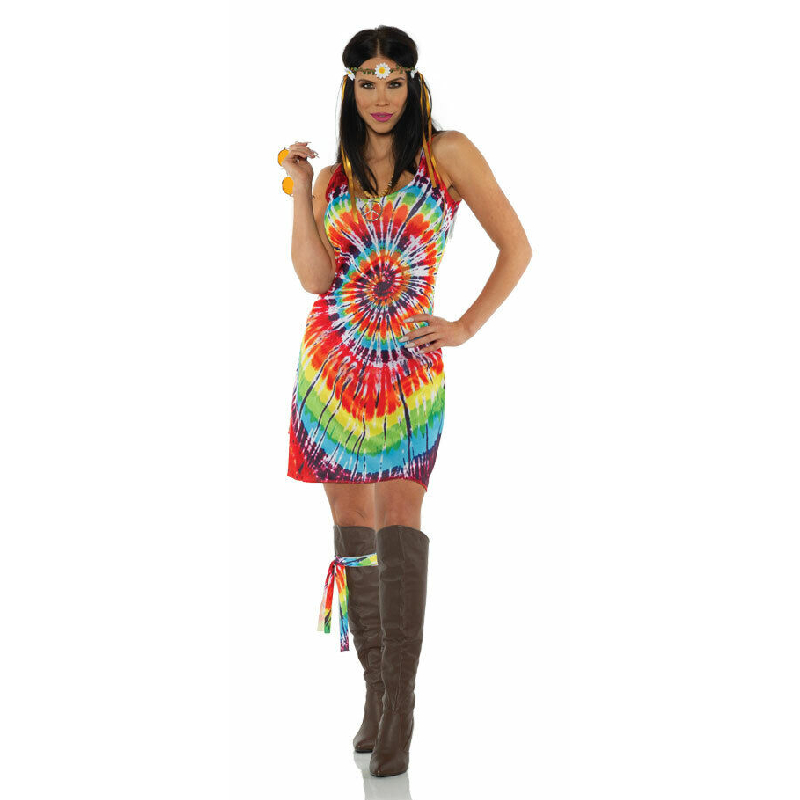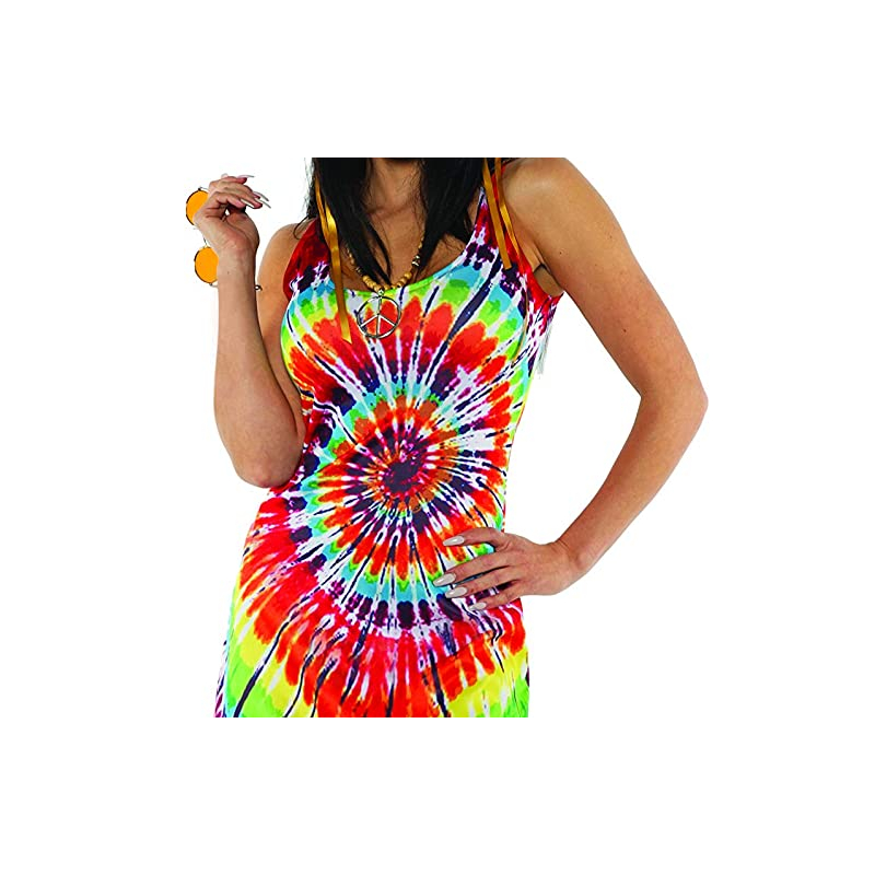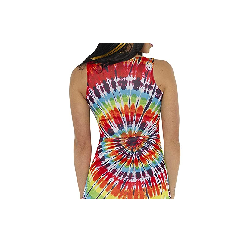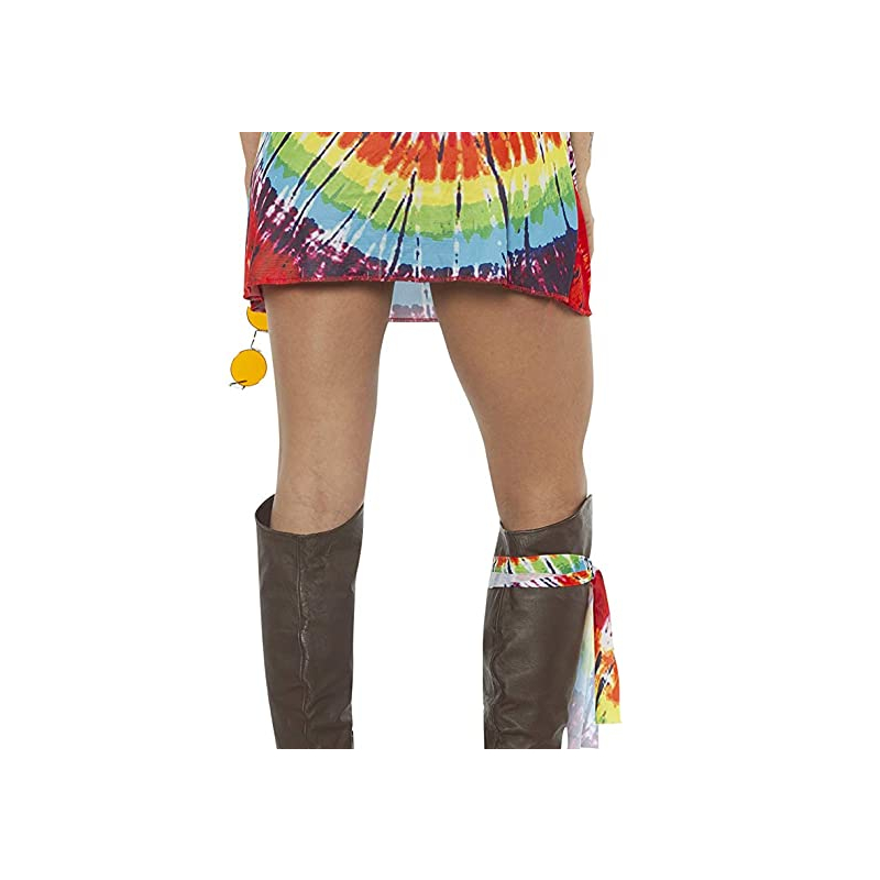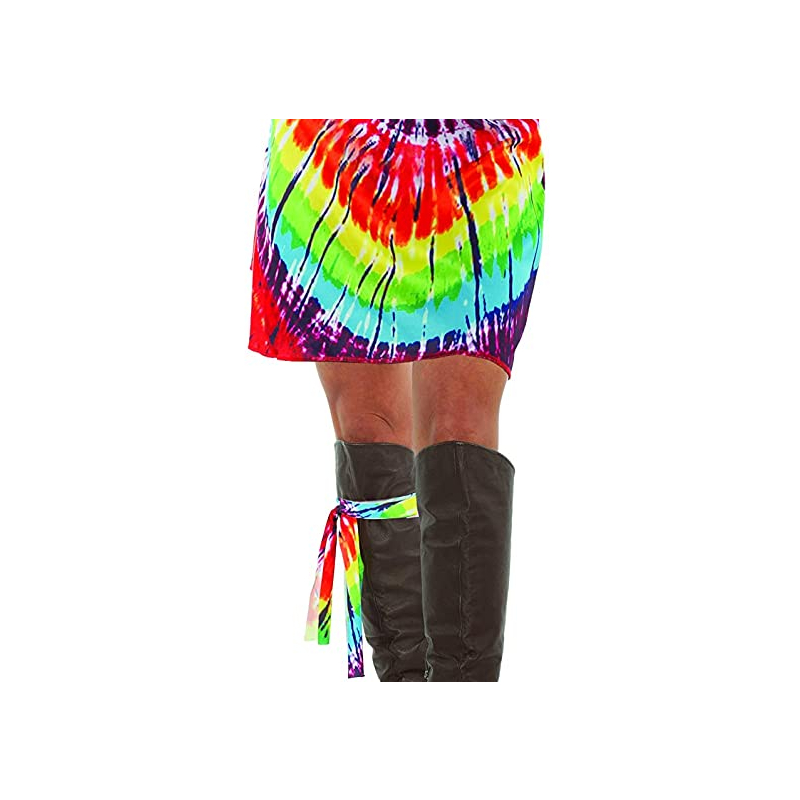 Look hip in Tie Dye Mini Adult Dress. Aww sooky sooky! This dress is perfect for Halloween, theatrical productions, reenactments, cosplay, drag, school plays, themed parties and more. This stylish dress makes a bold statement. Have a good time with this brightly colored dress. It’s hard to have a bad day while wearing bright colors. Although this dress is mini, it is comfortable and easy to wear. It is sleeveless with a scoop neck and sits just above the knees. There is a cloth band that can be worn around the leg as shown in the picture, your arms or as a headband.