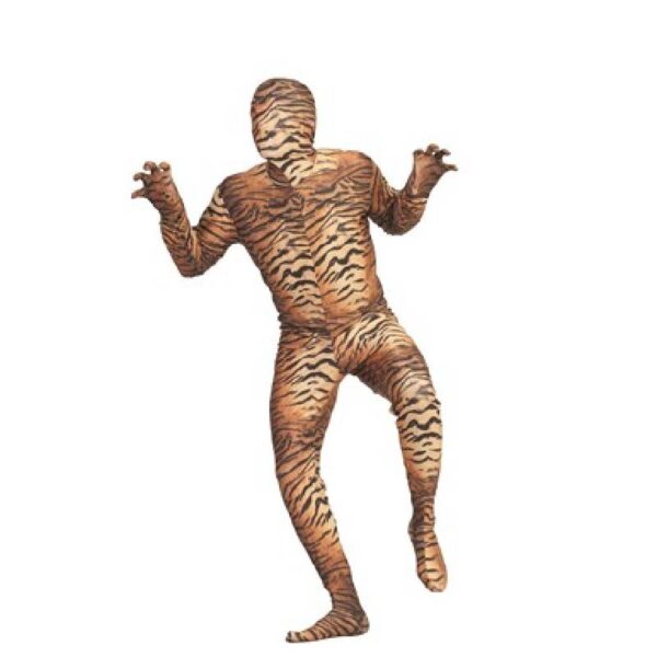 This Tiger Skin-Suit Costume has an attached hood, gloves and socks. This stretch body suit features a zip closure. It is available in Tiger print. Choose from2 adult sizes: Medium, or Large. Wear this for various types of costumes, Halloween, stage productions, and more!
