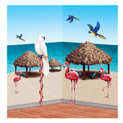 Tiki Huts, Flamingos and a White Tropical Bird are great props for your beach scene.