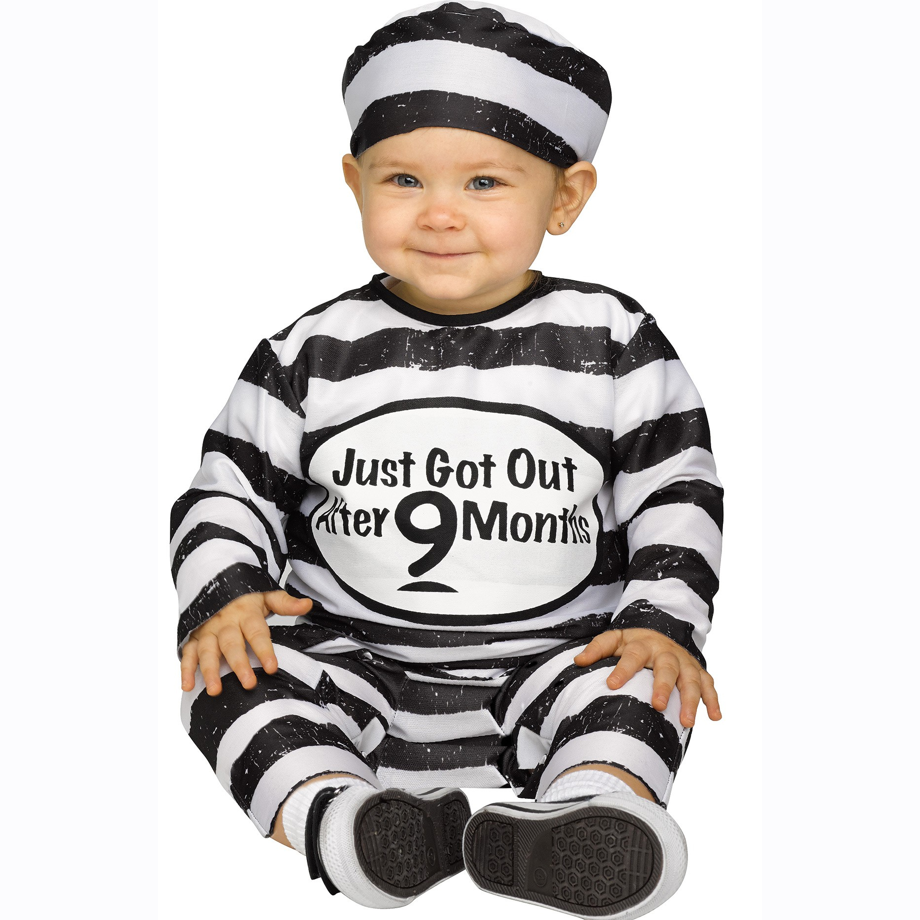 Infant Convict Halloween Costume includes a black and white striped cap and jumpsuit emblazoned with “just Got Out after 9 Months”.