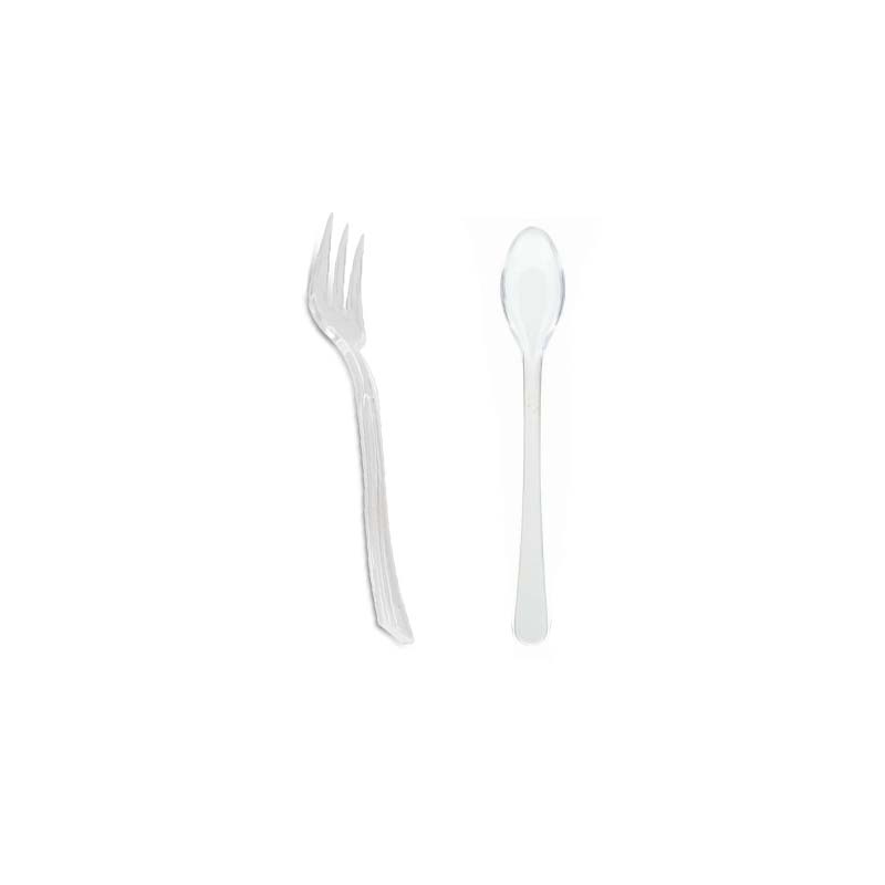 Tiny Cutlery Clear Plastic forks and spoons. 48 pieces per package. 4″ long each. Use these for tasting menus or offering samples to guests or customers!