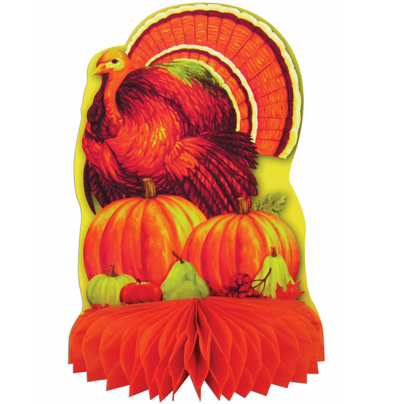 Put one of these 10-inch Turkey with Pumpkins Centerpieces on your fall or Thanksgiving table. Base is orange tissue. Perfect fall centerpiece!